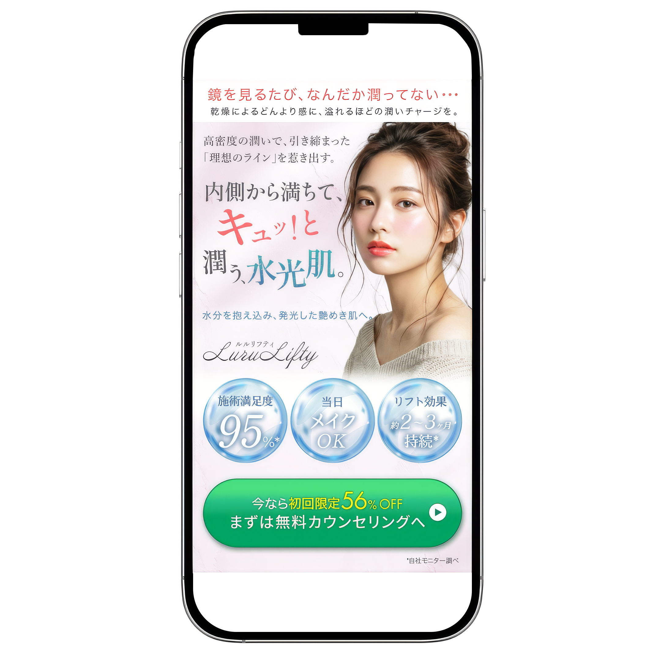 「リフトアップによるスッキリ感」と「やさしく澄んだ世界観」 に沿って、全体のトーンを 清潔感・透明感・信頼感 で統一しました。