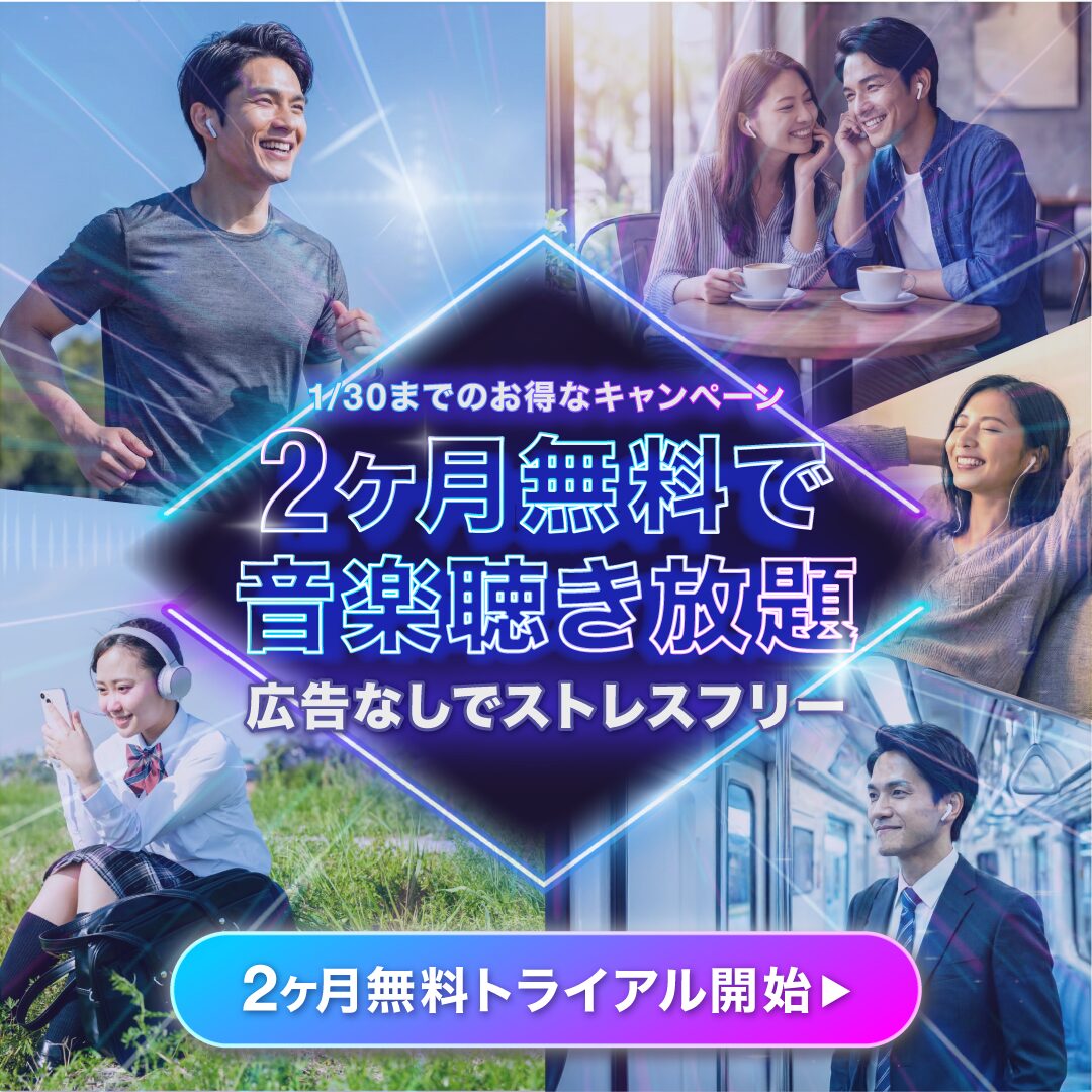 音楽の洗練された雰囲気や、近未来感のイメージが伝わるビジュアルをご希望。また「2ヶ月無料で音楽聴き放題」というベネフィットが伝わる構成のご希望から、メインコピーにネオンの配色フォントを採用。