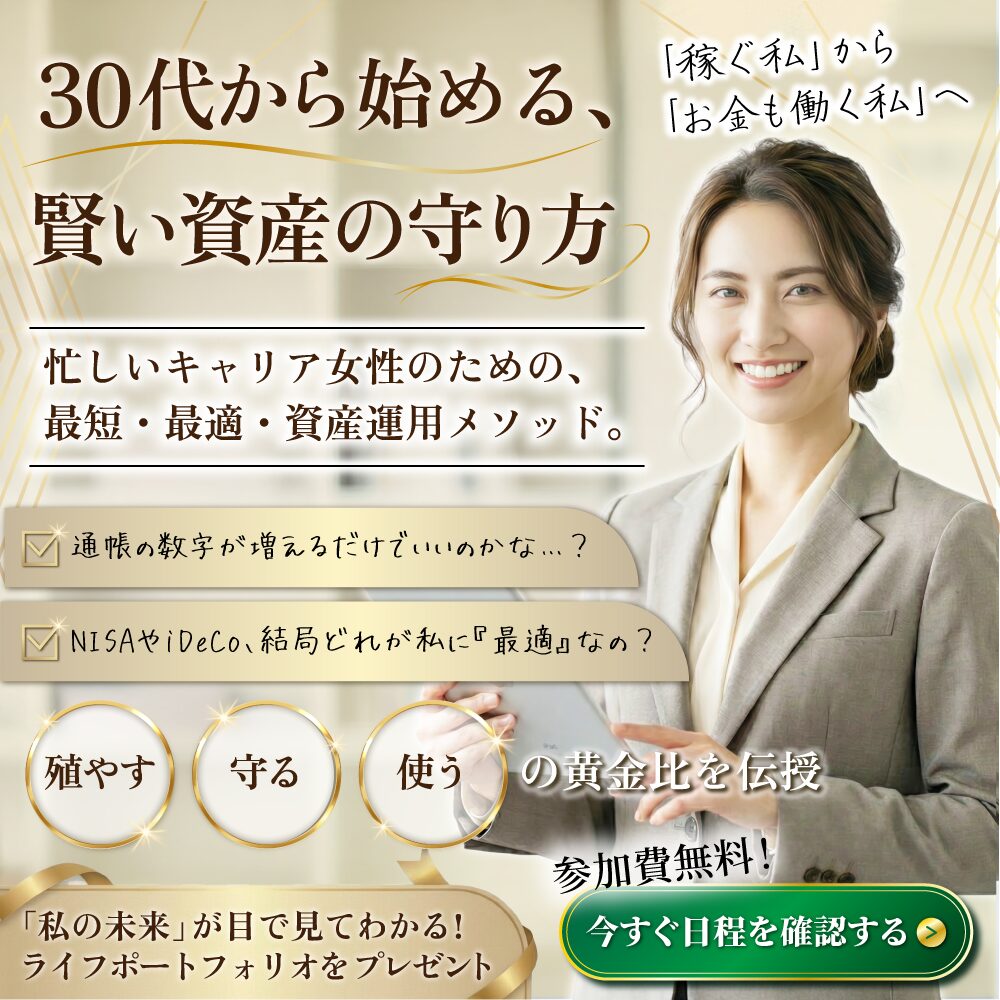 30代以上の働くキャリアウーマンをターゲットとし、頑張って稼いできたお金にも働いてもらい、将来に向けての資産運用をしていきたい方向けのセミナーのバナーを制作しました。具体的に何が得られるか?を可視化させ、参加することで得られるメリットも記載し、アクションに繋げる構成にいたしました。